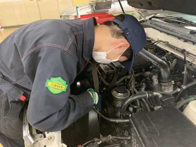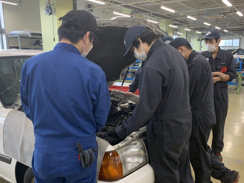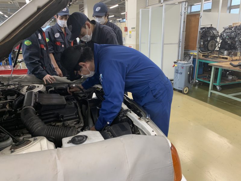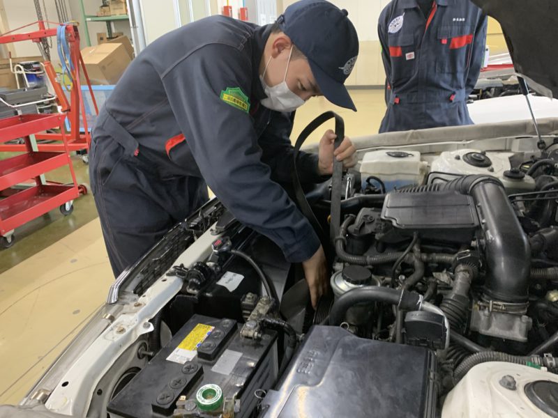今日は実習場の2階でシステム工学科3年生がコンフォートのサーペンタインベルトの取り付け、取り外しの反復練習をしています。サーペンタインベルトとは、オルタ、エアコン、パワステなどの補器類を一本のベルトの取り回しで駆動するタイプのベルトのことです。それぞれを別ベルトで駆動するタイプに比べれば手間は掛かりませんがコツが必要です。山内先生のアドバイスを受けながら、何度も繰り返し練習をしていました。(yagawa)