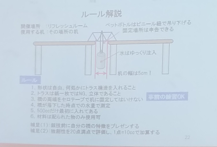 これがやってみると中々奥が深くて、最初は訝しげにみていた学生達も最後は熱中して橋造りをしていました。更に採点基準は耐えられた重量のみならず、プレゼンの秀逸さも含み総合力を問われるものとなりました。