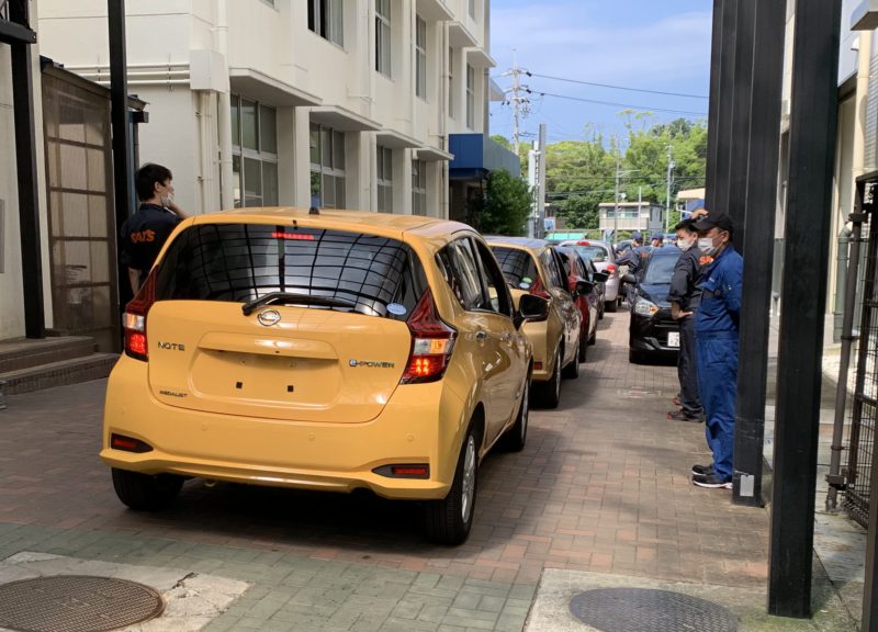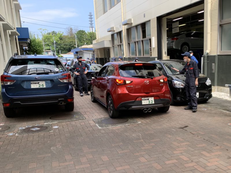 自動車システム工学科1級エンジニアコースの学生たちは2級自動車整備士の資格(2G、2Dの両方)を取得しないと3年生にはなれません。無事3年生になると整備士資格があるので本校(指定工場・認証工場です。)のメカニックとして登録しナンバー付の車両の点検や車検を行います。今日はお客様の大切なお車に傷をつけない様に教材車両を使用して車庫入れ、誘導の練習をしています。とはいえ教材車もほぼ新車を用いるのでヒヤヒヤものです。(笑)(yagawa)