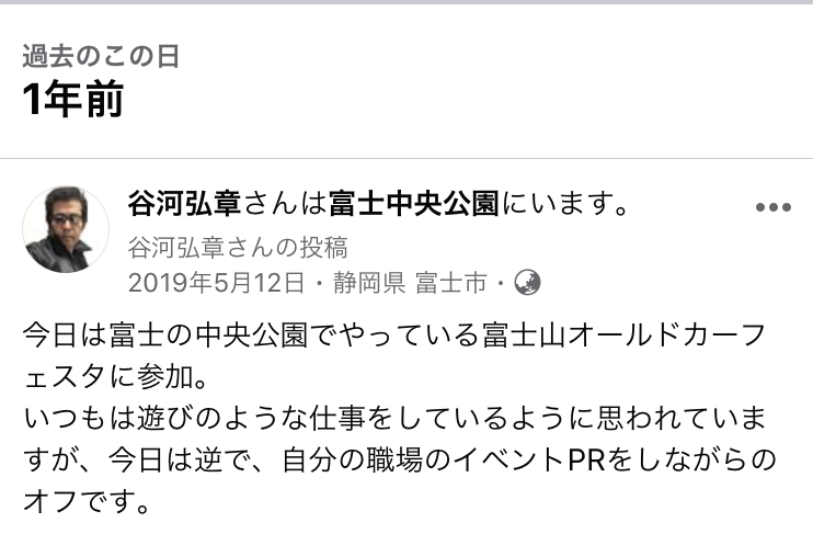 フェイスブックではちょうど1年前、2年前などに投稿した内容が「思い出」という形で出てくるんですが、今日は自分のアカウントで1年前に投稿したイベントの様子が写真の様に出てきました。「富士山オールドカーフェスタ」という旧車のイベントに参加して、ちゃっかり本校の「静岡カーフェスティバル」のPRをしているという内容です。この富士のイベントも今年はコロナウイルスの影響で中止となり、本校の「静岡カーフェスティバル」もまだまだ実施できるか分からない状況です。コロナの終息を祈りつつ過去の思い出に浸っています。(yagawa)