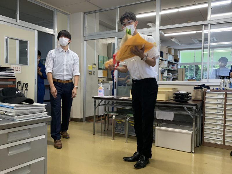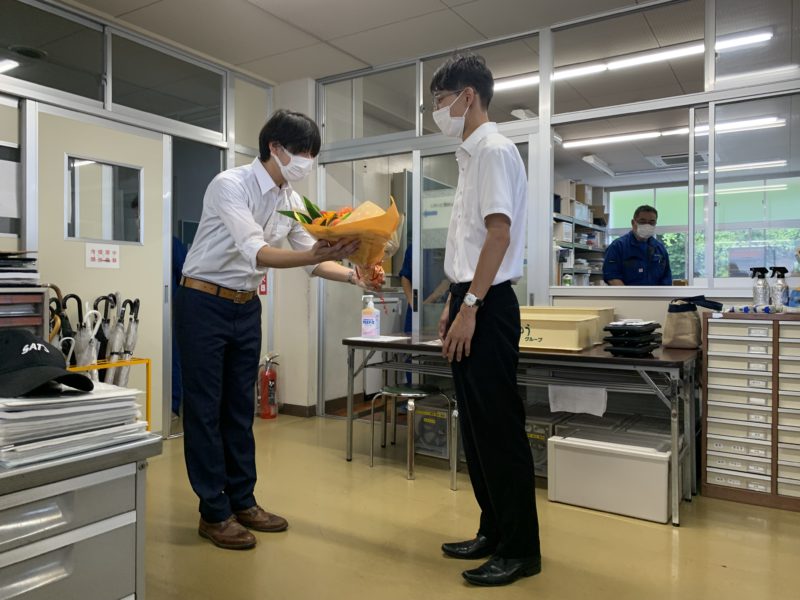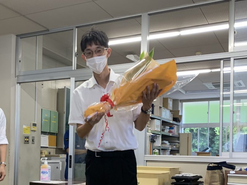 鈴木希先生が8月末で退職されました。新型コロナウイルスの感染症対策の影響で、外部での歓送迎会は行えませんので、30日の昼、職員室にてささやかではありますが送別会を開きました。ご本人よりご挨拶いただき花束の贈呈をしました。鈴木先生お疲れ様でした。今後は千葉で新たなお仕事に就くそうです。頑張って下さいね!(yagawa)