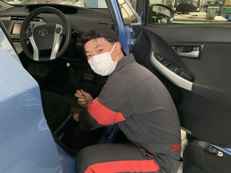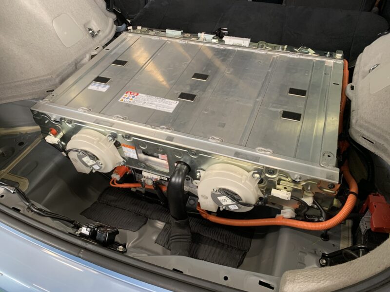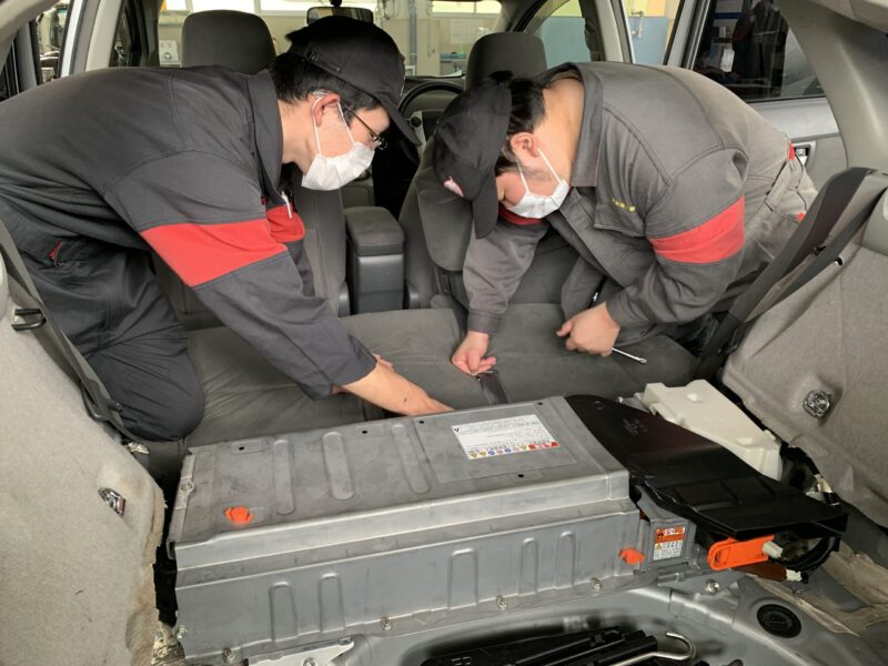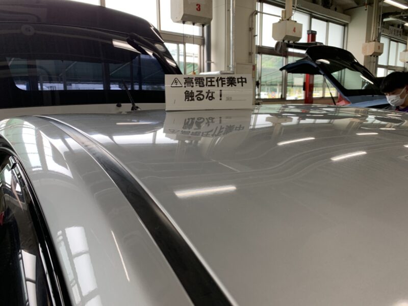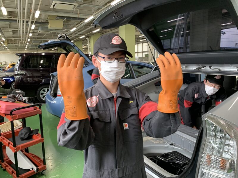 天井に「高電圧作業中触るな!」の注意喚起をし、必要な内装を取り外し、いざバッテリーの取り外しには絶縁手袋をして作業を行います。通常のHV車(3枚目)とプラグインのバッテリ(4枚目)の大きさの違いなどを確認していました。(yagawa)