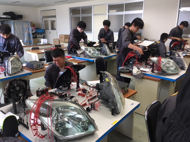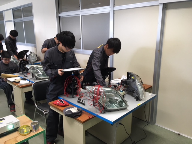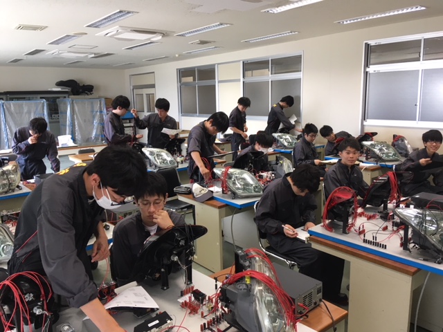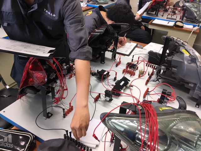 整備科1年生の電装基礎1の実習風景です。この実習は実物の自動車の①灯火類や②リレー、③スイッチなどが取り付けられているトレーニング・ボードを使用して、回路図を見ながら①~③それぞれを配線コードで正確に繫いでいくという実習です。