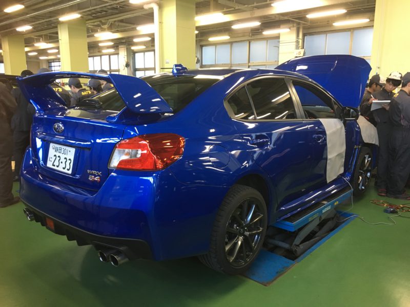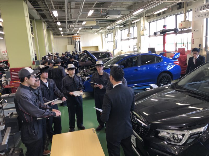 本日午後、静岡スバル様に御来校いただき、自動車整備科の1年Aクラス1班に対し企業様による実習を実施していただきました。これは企業様と連携を図り、最新技術や知識を身につけられるようカリキュラムを編成し、実践的な職業教育を行う専門課程となるよう平成26年より取り組んでいるものです。