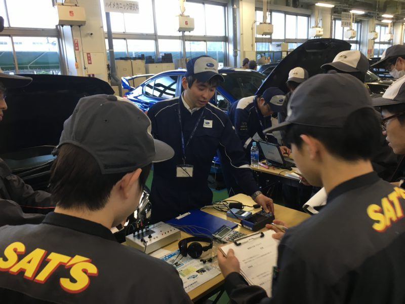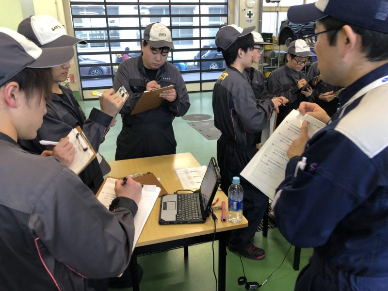 実習場では3グループに分かれ、①振動騒音、②故障現象、③最新装備の確認の内容をローテーションしての実習を行っていきました。