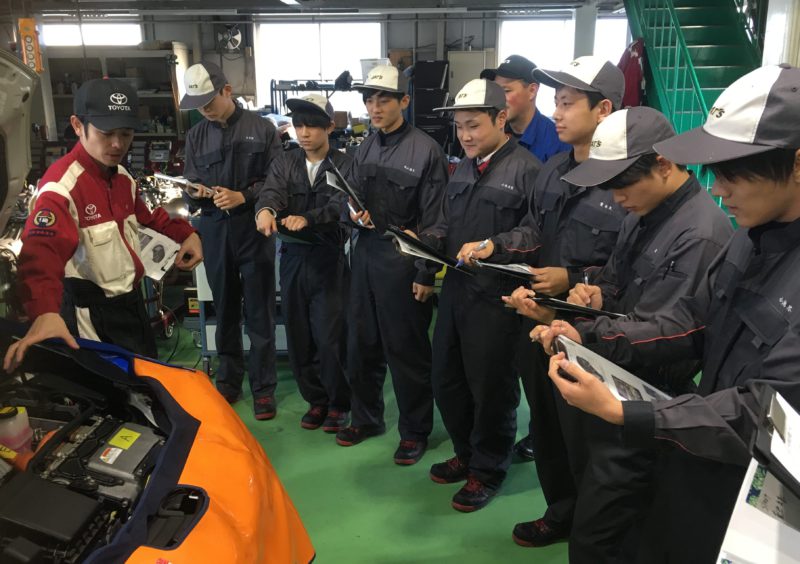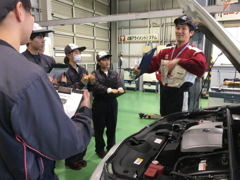 本日午後、自動車整備科の1年Bクラス3班の学生が静岡トヨタ様に伺い、企業様による実習を受講しました。これは企業様と連携を図り、最新技術や知識を身につけられるようカリキュラムを編成し、実践的な職業教育を行う専門課程となるよう平成26年より取り組んでいるものです。