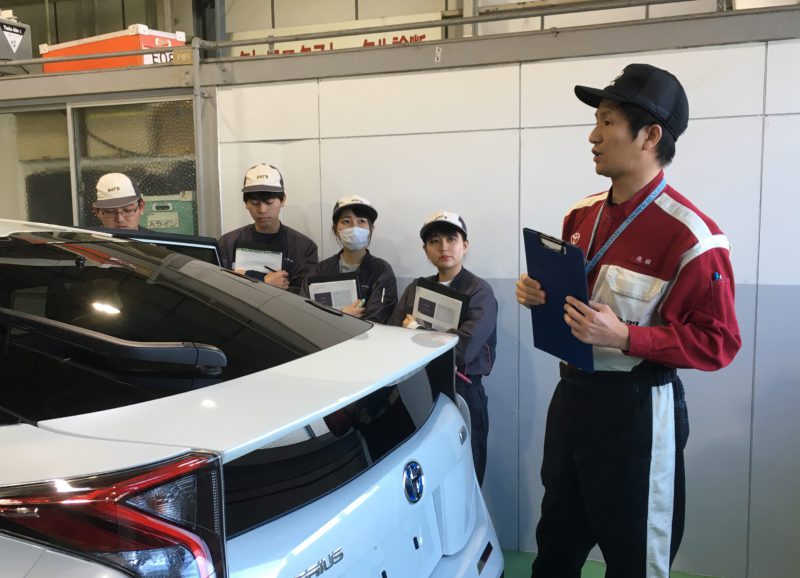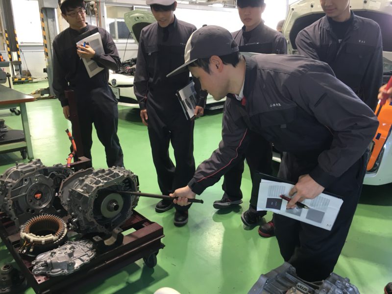 前半はハイブリッドシステムの座学説明を聞き、後半は実習場で2グループに分かれて実際のパーツの位置や働きを確認していきました。