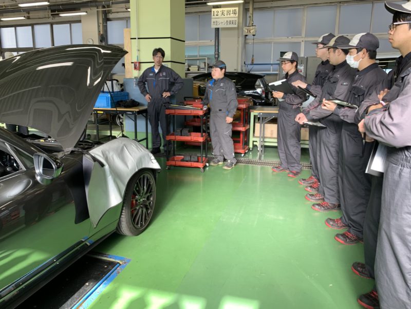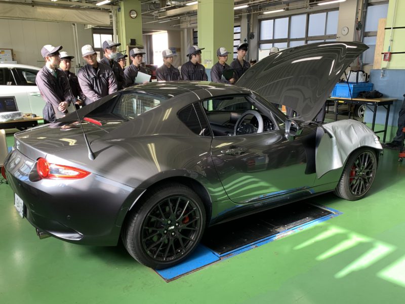今日は、10日の午前中に静岡マツダ様に御来校いただいた企業実習の様子をご紹介。自動車整備科の4班の受講です。まず先輩エンジニアによる12か月点検のデモを見せていただいたのち、2グループに分かれロードスターによるMDSを使用しての点検、MAZDA3の見取を行いました。