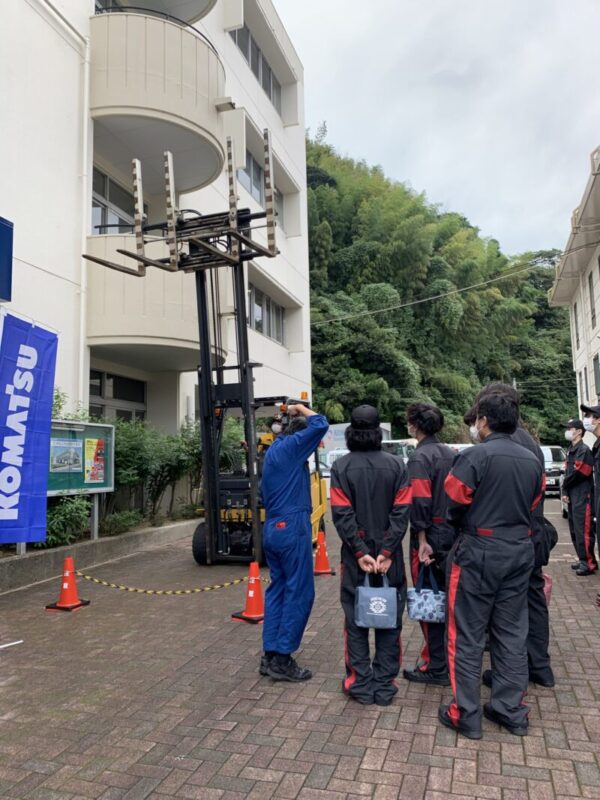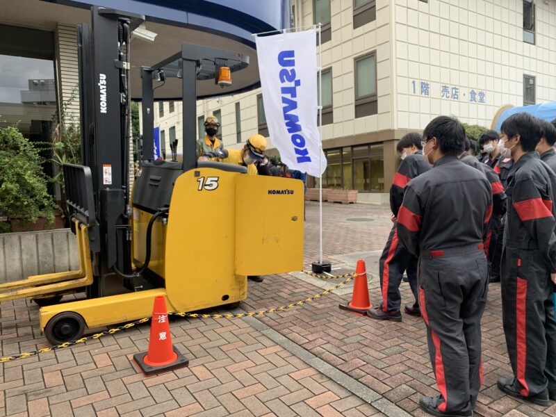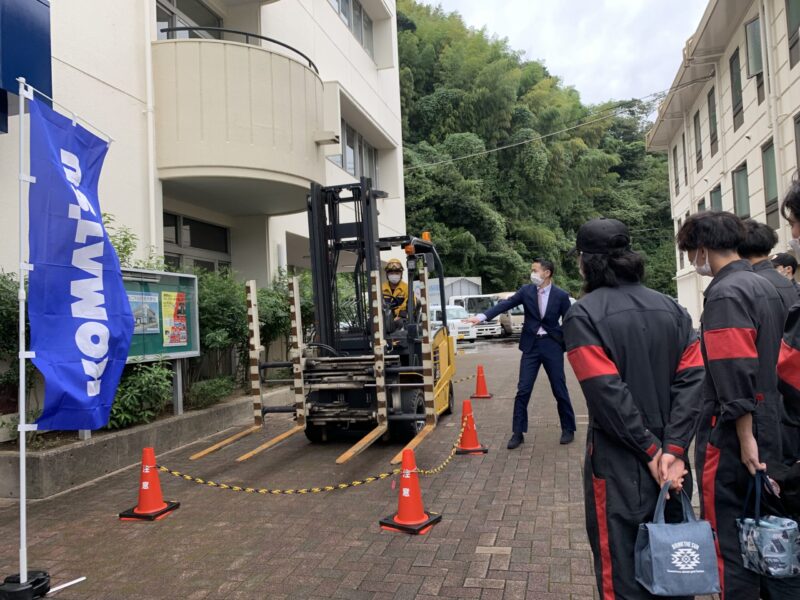 本日、お昼休みの時間帯に静岡小松フォークリフト様のフォークリフトの展示ががありました。お昼休みの時間、2台の展示車両のデモンストレーションをしていただき、学生たちは興味深く見学していました。普通の乗用車の展示とは違い、搬入搬出の運送手配をしての展示です。貴重な時間を作っていただきありがとうございました。(yagawa)