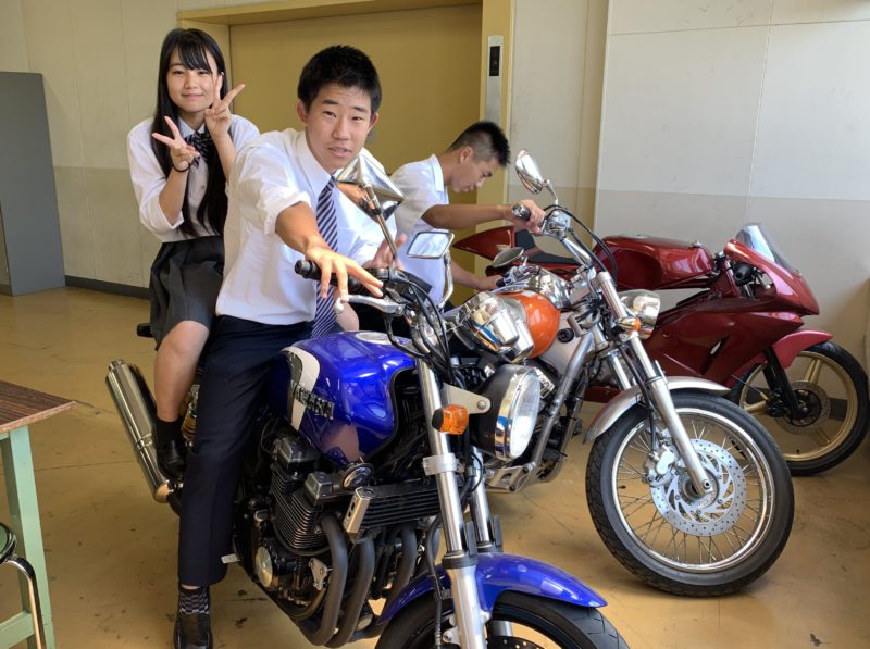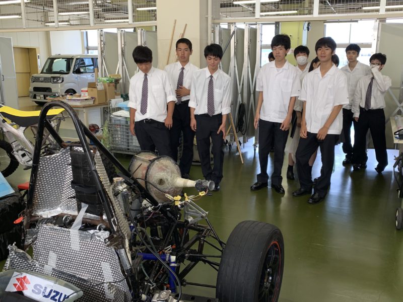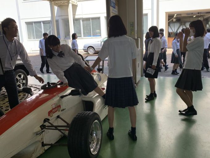 本日、静岡北高の1年10組と12組の生徒さんが北高と本校の連携講座を受けに来校しました。今回は高・専一貫コース説明、お試し実習体験、施設見学などを行いました。私が施設見学担当だったのでそちらの写真がメインになりますが、カスタムカーやレーシングカー、GT-R、教材車のバイクなどに興味を示し、喜んでハンドルを握っていました。クルマ好き、バイク好き集まれ!!(yagawa)