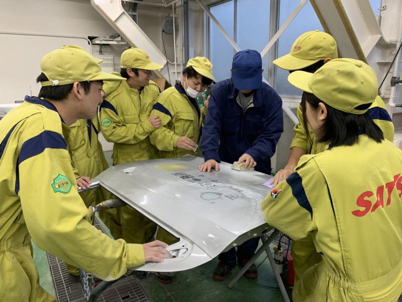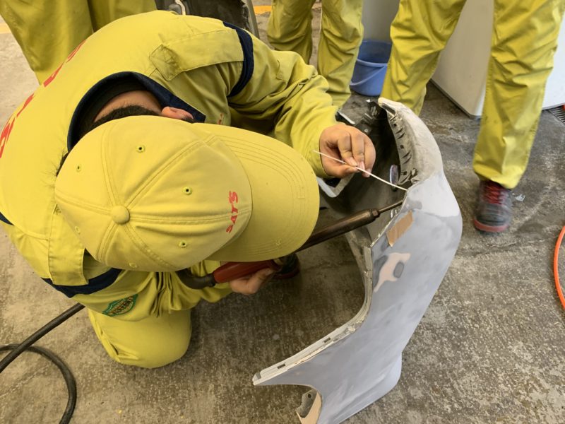 本日、本校卒業生である鳥居自動車様のご厚意で、本校ボディデザイン研究科に対して講習をしていただきました。内容はUVパテと樹脂溶接機のデモと体験です。UVパテは紫外線を当てると硬化するパテで、通常の硬化剤を混ぜるタイプよりも格段に時間を短縮できるパテなんだそうです。樹脂溶接は割れた樹脂パーツを溶かして接合するものです。今までの同様のタイプよりも強度が比べ物にならないのだとか!すばらしい!!