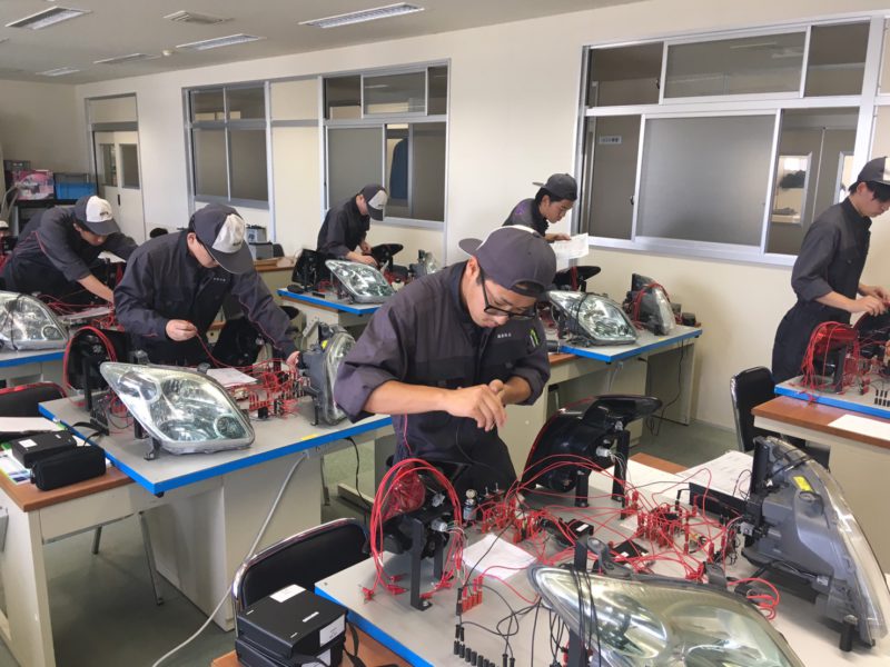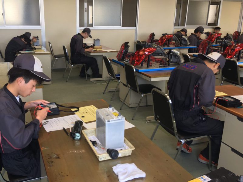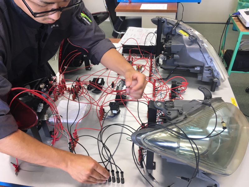 昨日は、自動車整備科1年生の実習試験がありました。実習は1日4時間を7日間掛けて1つの内容完結で習得していきます。その最終日に習熟度合いを確認するために実技試験を行います。写真は「電1」という科目の試験風景で、2~3枚目の写真は配線図を見ながら自動車の灯火類の配線をして条件に合った点灯・点滅をするように時間内に配線します。(yagawa)