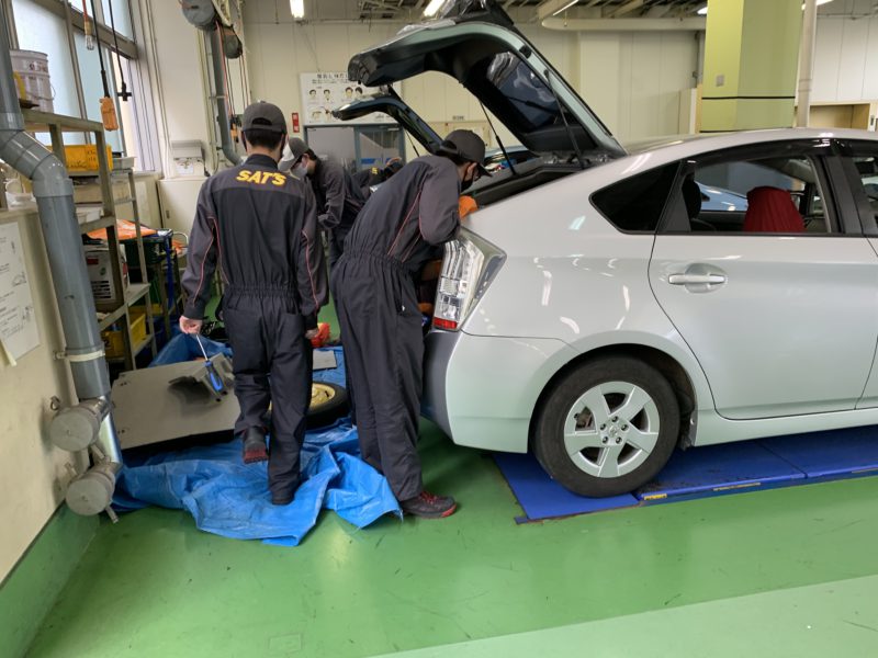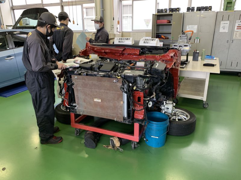 今ではハイブリッド、電気自動車も珍しくなくなり、あちこちで見かけるようになりました。それだけ整備する機会も増えているので各社のシステムをしっかり理解しておきたいものです。こちらの実習ではトヨタのコムスを始め、各車のバッテリ脱着を行っています。4枚目の写真はおもちゃの工具のように見えますが、前述したような作業を行う際に使用する絶縁工具です。カラフルですね。(yagawa)