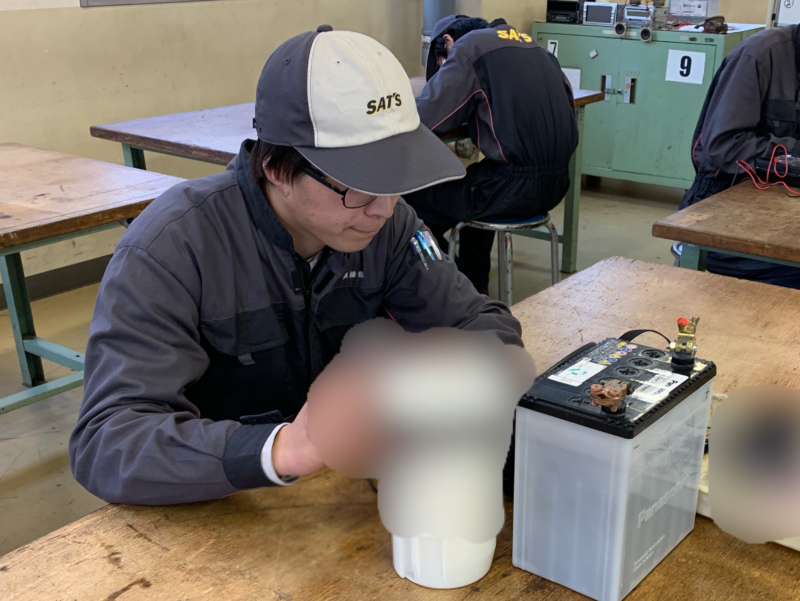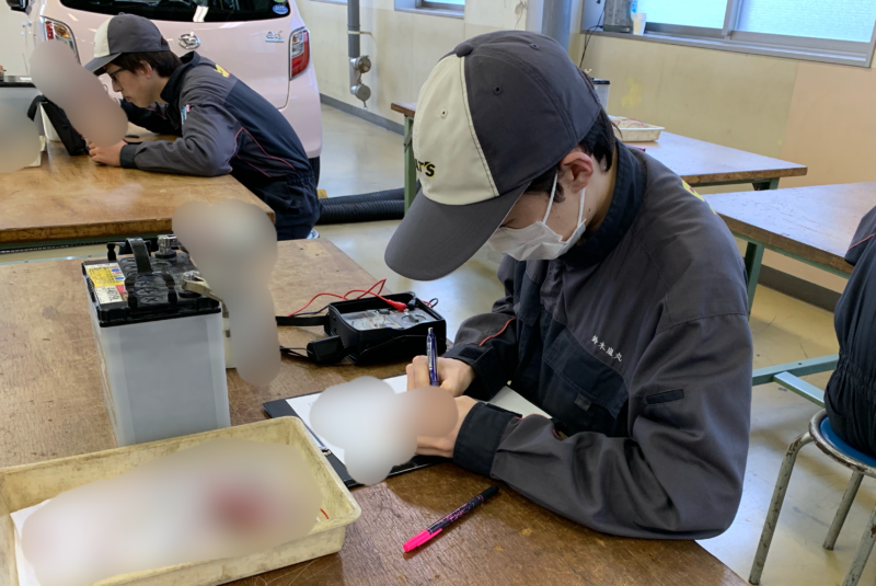 今日は自動車整備科の1年生は電装の実習の試験を受けています。最後の確認試験はリレーを使っての電気回路の組み上げなどです。テスターを使い端子の用途を確認し問題と格闘しています。担当の廣石先生にネタバレになっちゃうかな?と確認したらリレーの画像はNGとのことでしたが一応全体にモザイク掛けておきます。(yagawa)