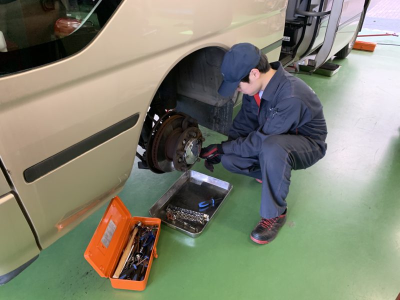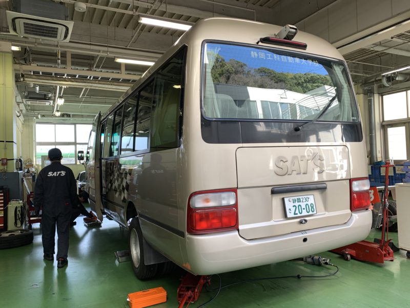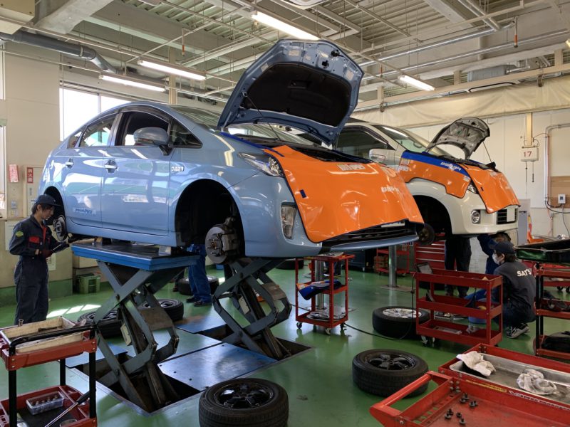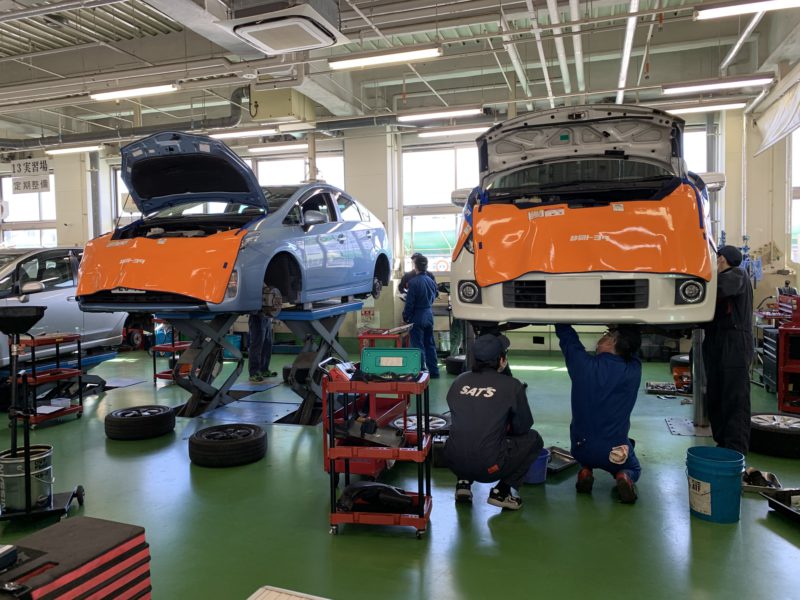 自動車システム工学科の3年生は2級整備士の資格を取得しており、本校認証工場の整備士としても登録しているので、ナンバー付の車両の定期点検や車検も行います。今日は学校のマイクロバス、校用車のプリウス他、職員のエルグランドの車検などで忙しく整備をしています。やはりナンバー付車の整備は責任感が増し真剣です。(yagawa)