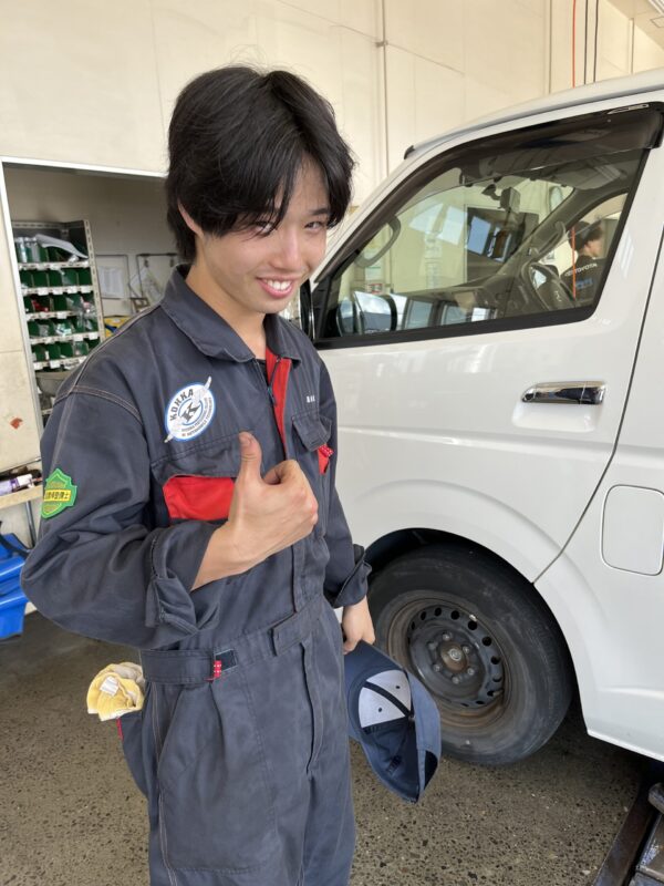 工場で汗だくになりながら作業していましたがカメラを向けたらポーズをとられてしまいました。当日はサイドブレーキの位置がわからずにあたふたしていましたが、店長様はじめ先輩方とコミュニケーションとりながら仕事をこなしているように見えました。