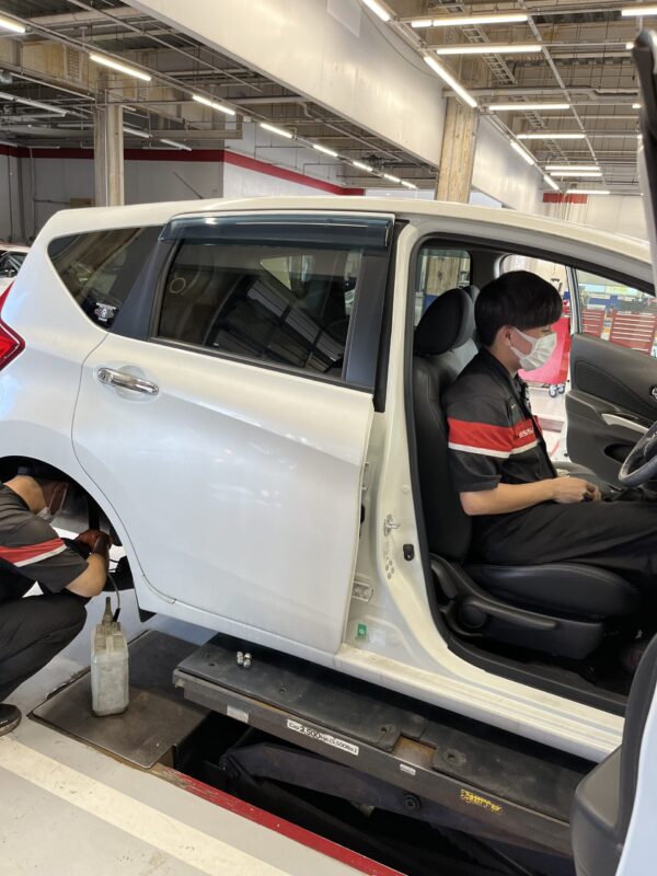 卒業生についていただき車検整備を教わっていました。色々な工具やGT-Rが次々と入庫してくることに驚きと興奮しながら作業していました。