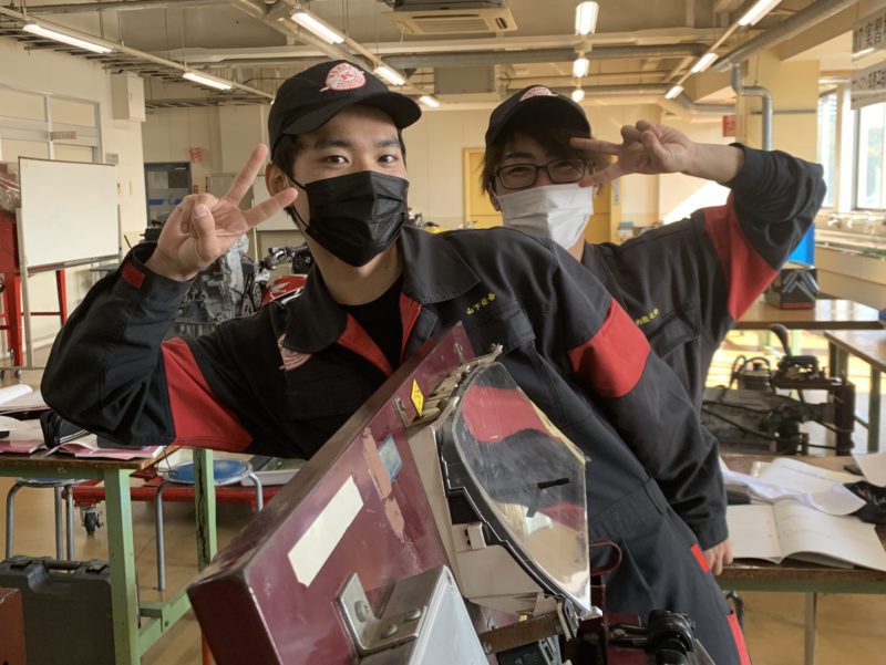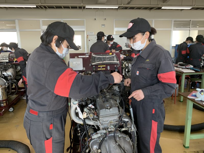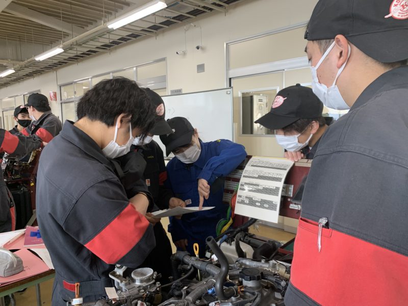 自動車システム工学科1年生のEFIの実習。渡辺優姫先生です。パワーバランスによる診断とバキュームセンサーの電圧チェック中でした。汗(yagawa)