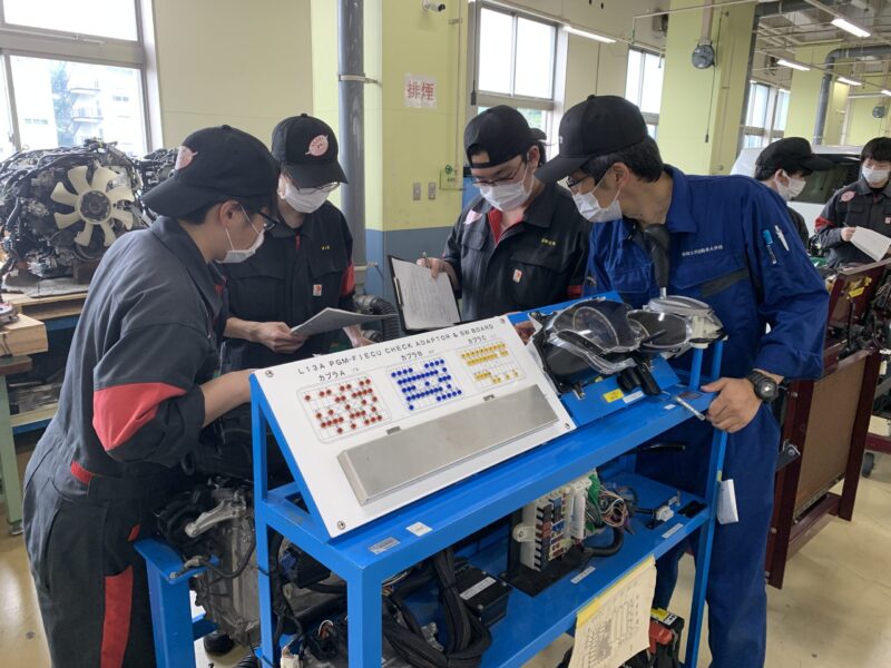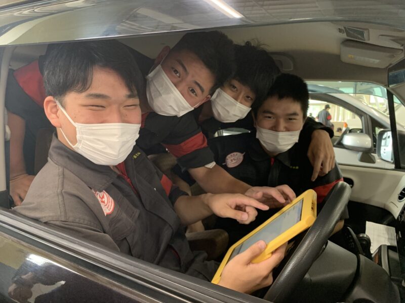 本日は、自動車整備科の2年生の電子制御実習。佐々木先生と大石先生です。佐々木先生からここの実習を是非HPに載せてくれ!と熱烈なラブコールを受け本日の内容が決定。この班は1年生の時に実習の一部分もWEBだったので、その復習からです。エンジンの電子制御部品の取り付け位置の再確認、タブレット型の故障診断期の使用方法などの再確認をしています。あっ大石先生の写真撮るの忘れた!汗(yagawa)
