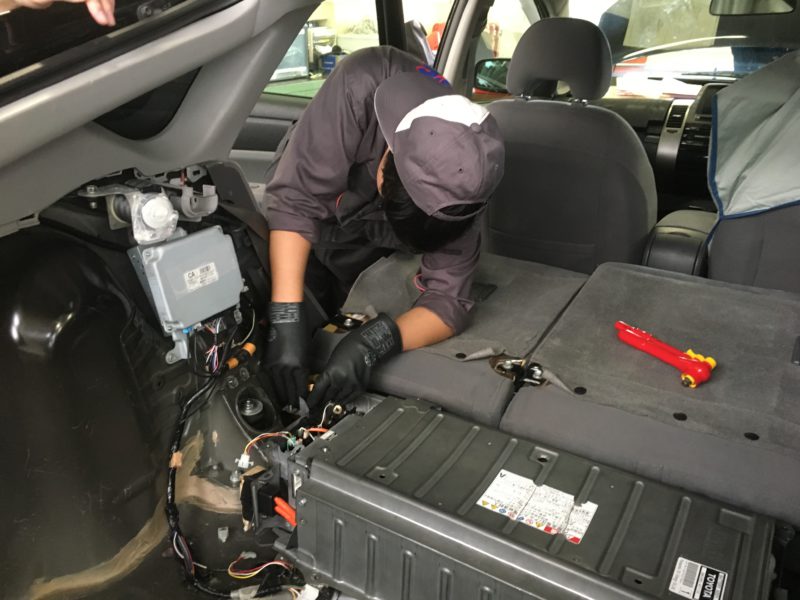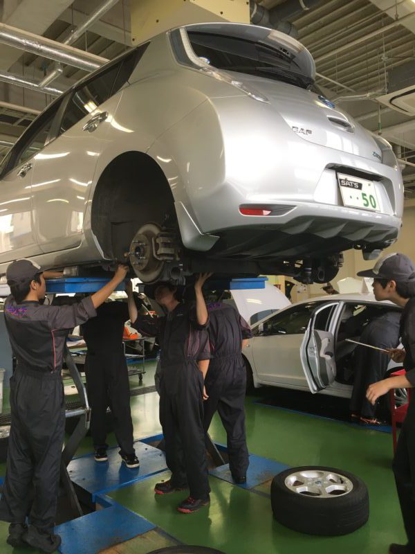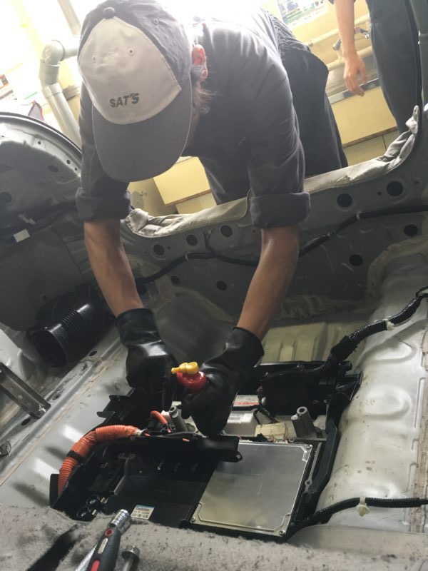 担任の中野先生によるEV・HEVシステムの授業です。ここでは電気自動車(日産リーフ、トヨタコムス)やハイブリッドカー(トヨタプリウス、ホンダインサイト)のそれぞれにおいてEV・HEVの基本や、メーカーによるシステムの違いなどを確認しています。