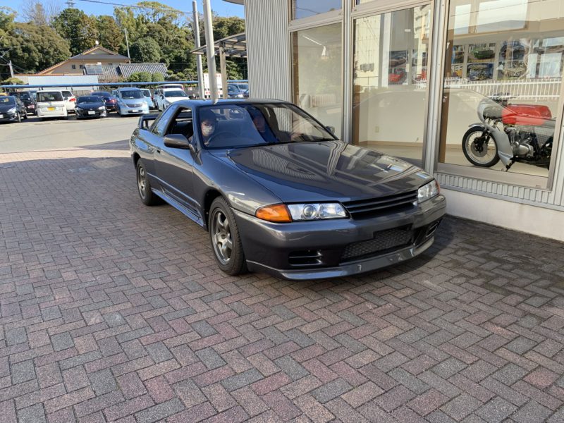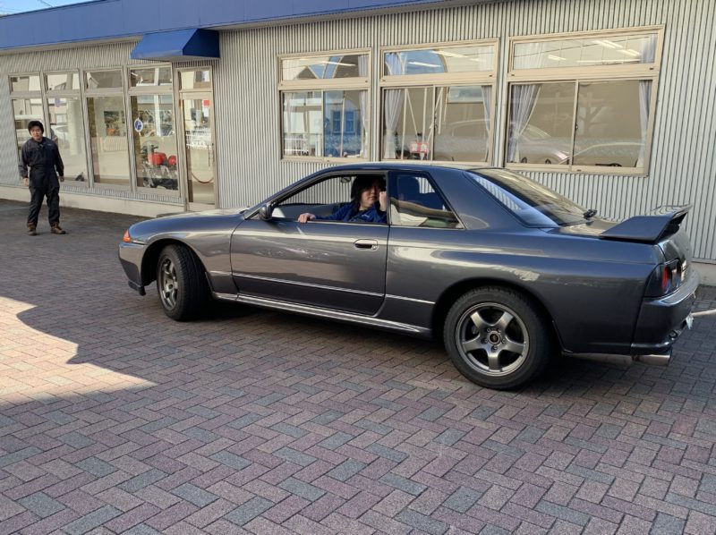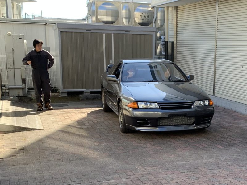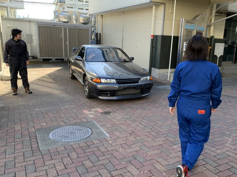 自動車整備科2年生の実習風景です。本校の正門を入ってすぐ左側にショールームがあり、ここではお客様がショールームにいらっしゃったことを想定したクルマの誘導訓練やお客様のクルマをお預かりすることを想定した運転練習なども行います。山本恵美先生の指導のもと何とR32GT-Rが練習に使われています。GT-Rへの憧れ?MT車が不慣れ?学生は緊張しまくりです。