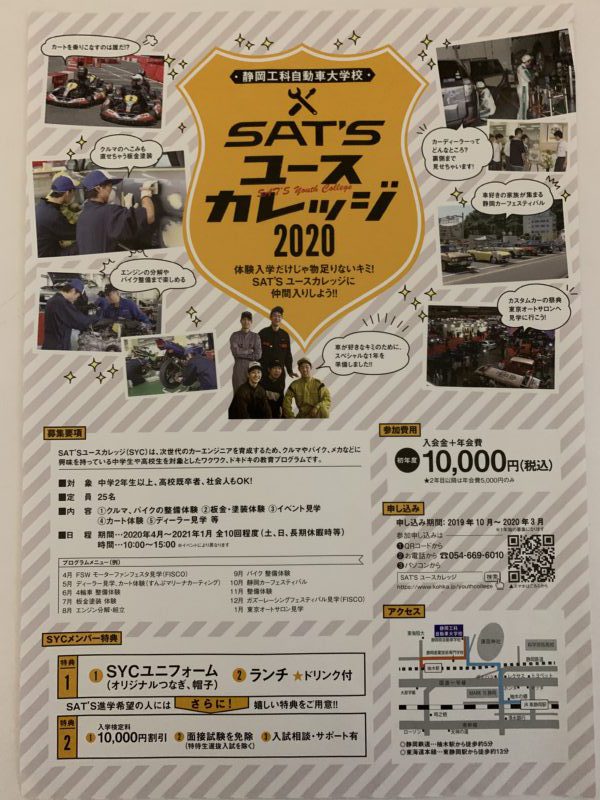 さて、今日は来年度のSAT’Sユースカレッジのメンバー募集のお知らせです。年間10回の活動で、外部へのイベント見学や校内での体験メニューを色々と用意しております。有料プログラムで年間1万円掛かっちゃうんですが、つなぎのプレゼントもあるし毎回お昼ごはんを用意しますのでとってもお得なんですよ。
