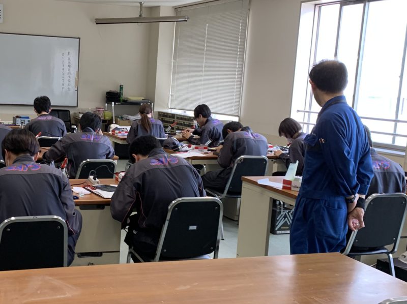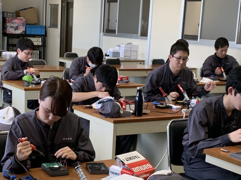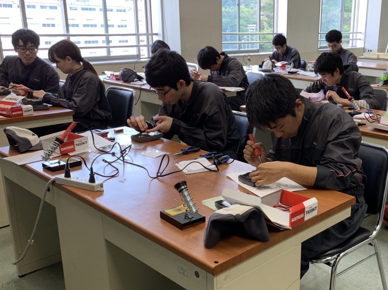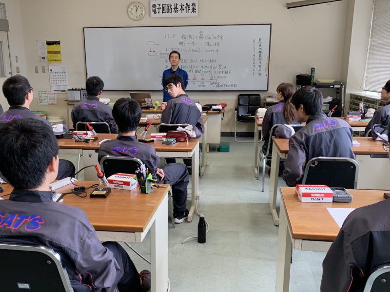 本校では1年生の最初の実習はエンジン関係、シャシ関係、電装関係などの基本的な内容を短期間に一通り学ぶ基本実習というスタイルを取っています。今日は石井先生の指導のもと自動車整備科の学生がサーキット・テスタを組み立てています。ハンダ付けの基本を学びながら自分がこれから使うテスタを組み立てるのですから真剣です。(yagawa)