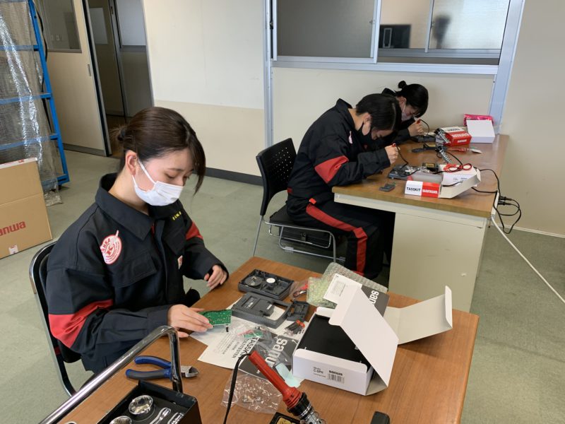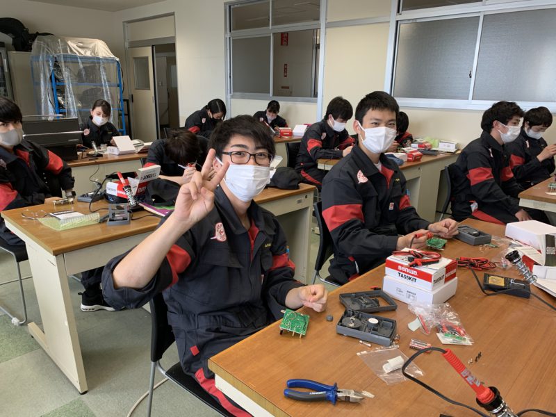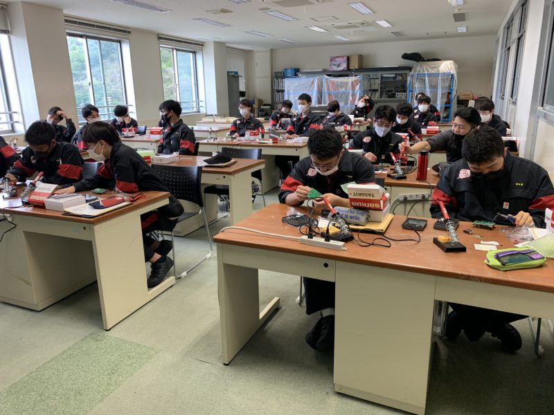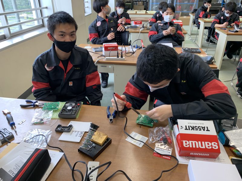 昨日に続き1年生の基本実習の様子をお伝えします。今日は渡邊広翼先生の電装の授業です。サーキットテスタの組み立てキットを組み立てながらハンダ付けの練習をしています。今日もみんな楽しそうです。昨日も書き込みましたが今年からツナギが変わりました。(yagawa)