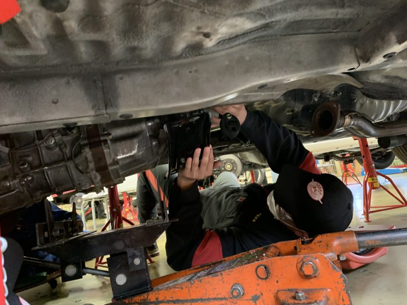今日はローアングルの写真から。シャシ実習でFR車のマニュアル・トランス・ミッションを降ろしていたのでパチリ!リジット・ラックで持ち上げた車からの作業は大変そうです。最後は無事取り外せました。