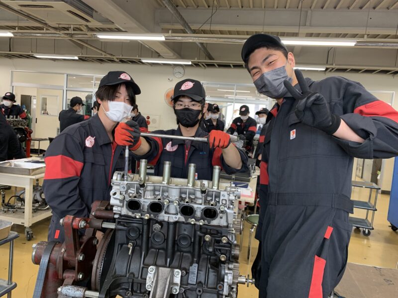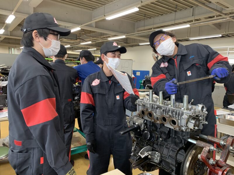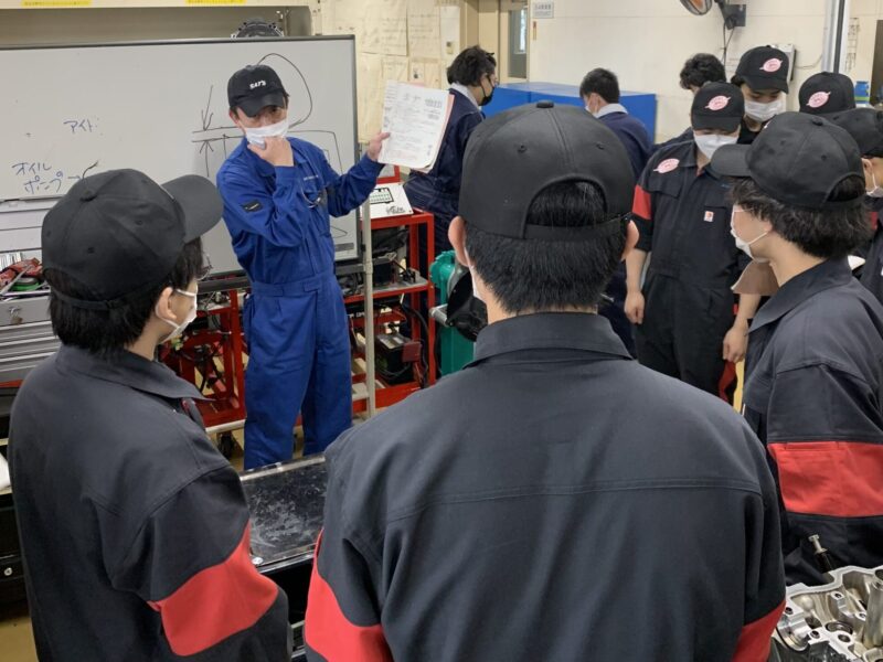 本日から本実習が始まった1年生。今までは実習での基本的な内容を、年度の最初に集めた基礎実習やWEBでの学科授業ばかりだったので、やっと本格的に自動車が触れる!っていう気持ちのようです。今日はシステム工学科の1年生1班が、堀内先生のエンジン分解をしています。伺ったときには楽しそうにカムの取り外し~シリンダヘッドの取り外しを行っていました。(yagawa)