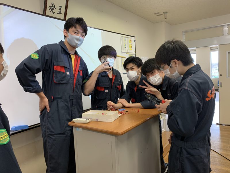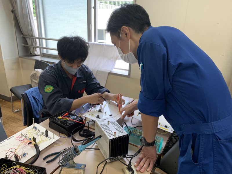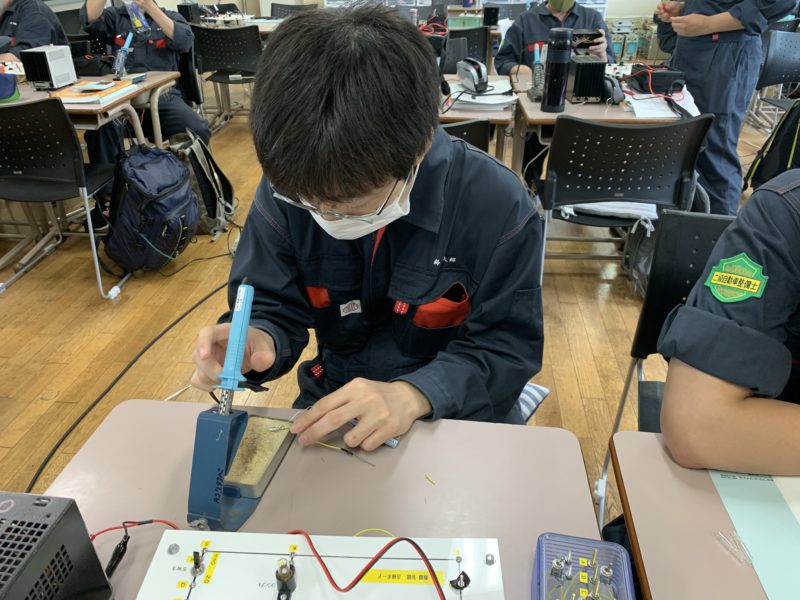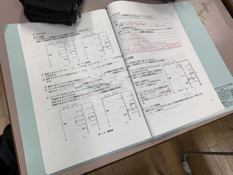1級整備士課程で使用するエンジン電子制御装置の教科書ではまず電気回路の基礎をきっちりと理解する必要があります。スイッチがON、OFFのそれぞれの状態の時、断線、短絡、線間短絡などが起きた(基本的には一か所のみのトラブル)場合に起きる現象を頭でイメージ出来なければなりません。今日は3年生が川口先生の指導で教科書と同じ回路のシュミレーターを使用して現象確認をしています。また同時に今後使用する教材も作成しながら、はんだ付け作業、電工ペンチの使い方なども復習しています。(yagawa)