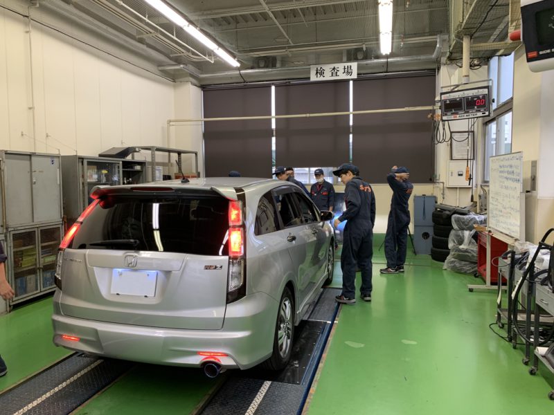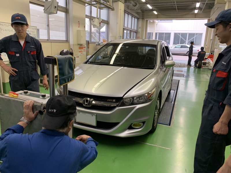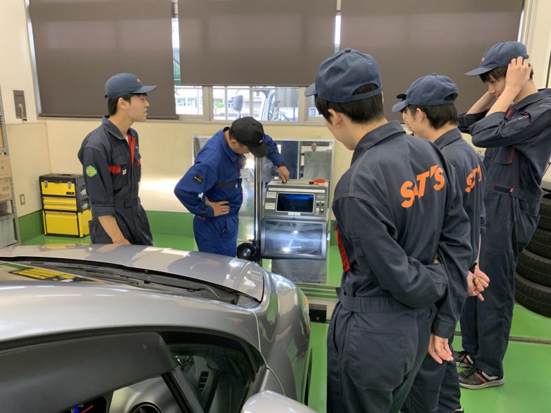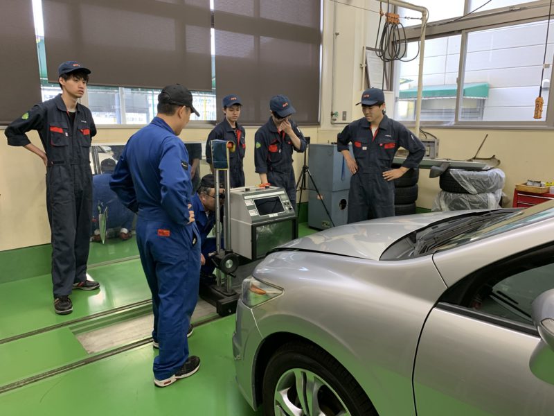本校は認証工場なのでナンバー付のクルマの車検を行うことが出来ます。3~4年生は整備士として登録してあるので、授業の中で自分のクルマの車検を行い本校の検査ラインを自分で通します。(指定整備工場でもあるのです。)今日は4年の渡邊君が自分のクルマを整備し、周りの仲間がヘッドライトテスターで測定中です。(yagawa)