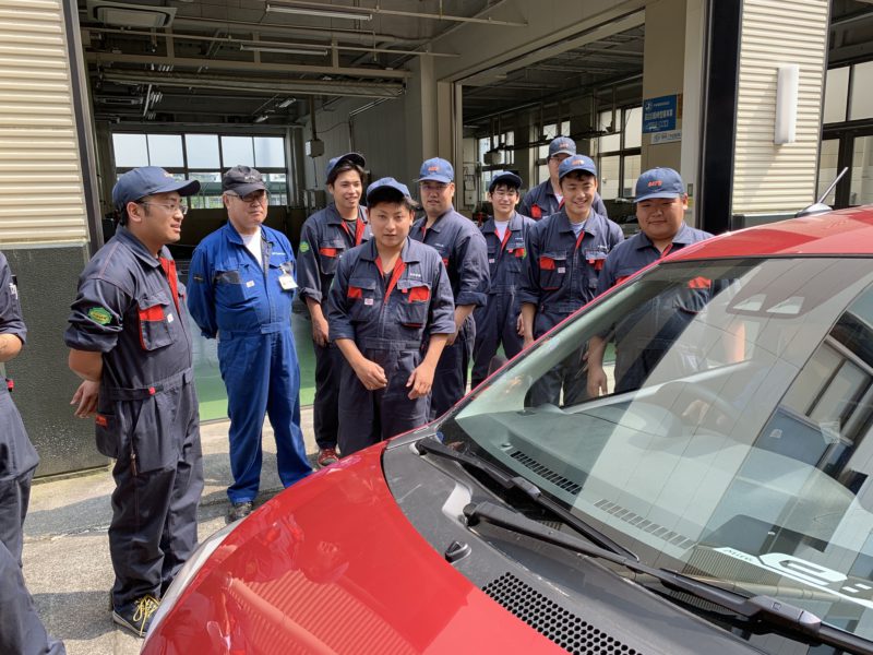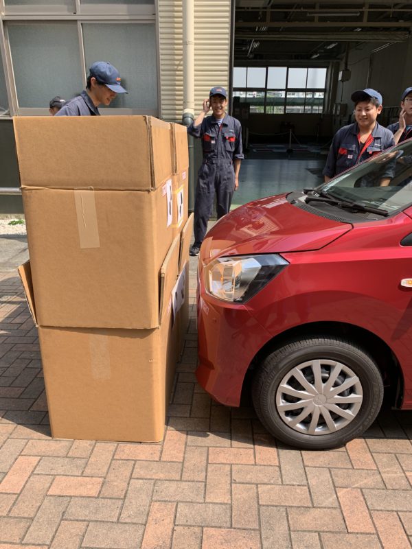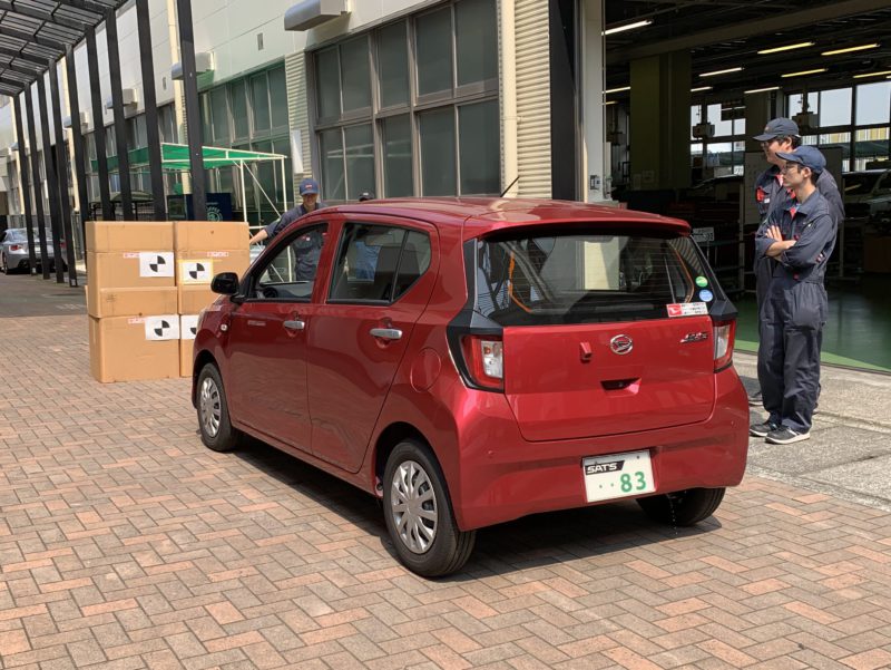 実習場では、1級エンジニアコースで体験してもらう「ぶつからないクルマ」の準備、確認をしていました。
