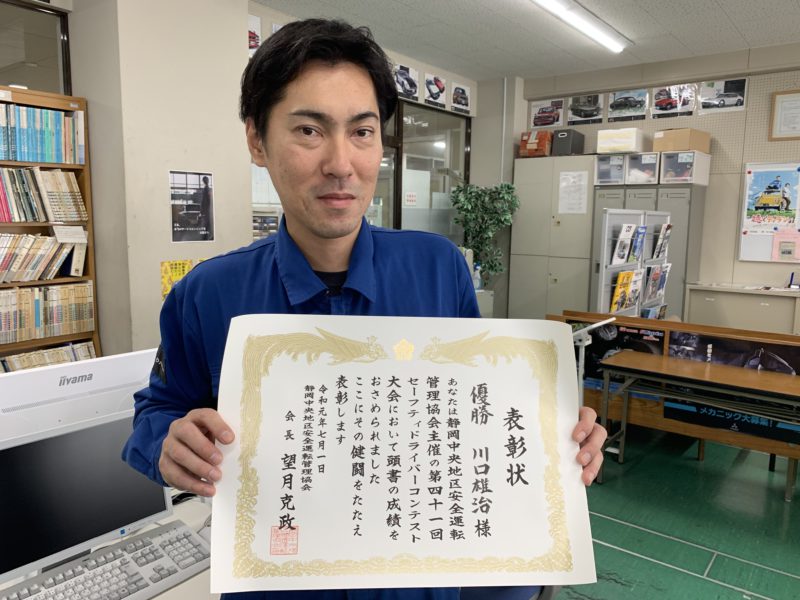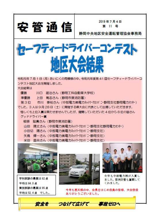 7月1日行われた静岡中央地区安全運転協会主催のセーフティドライバーコンテスト大会に本校の川口先生が出場しました。技能試験、実技試験共に高得点をマークし見事優勝しました。協会の会報誌にも紹介されました。次の県大会は川口先生のお誕生日である9月28日。次回も頑張ってください。(yagawa)