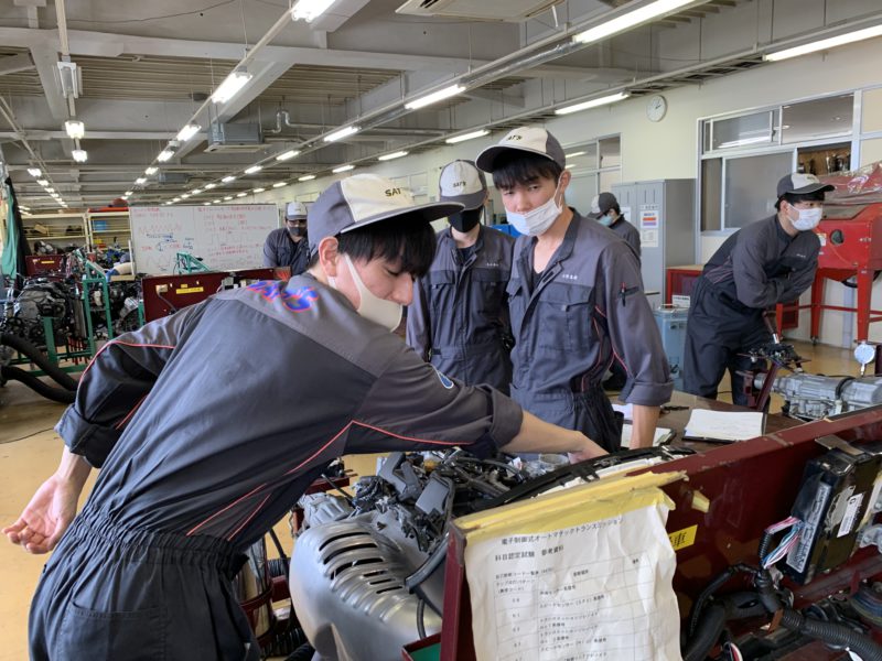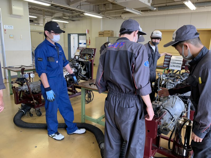 久しぶりの実習風景。自動車整備科の2年生の実習の様子です。実習棟の3Fでベンチエンジンを使ってストールテストをしています。ベンチエンジンをサイドブレーキを引いた状態でアクセルを全開にしたときの、DレンジとRレンジのエンジン回転数を測定し結果と基準値の比較をします。担当は山内先生です。(yagawa)