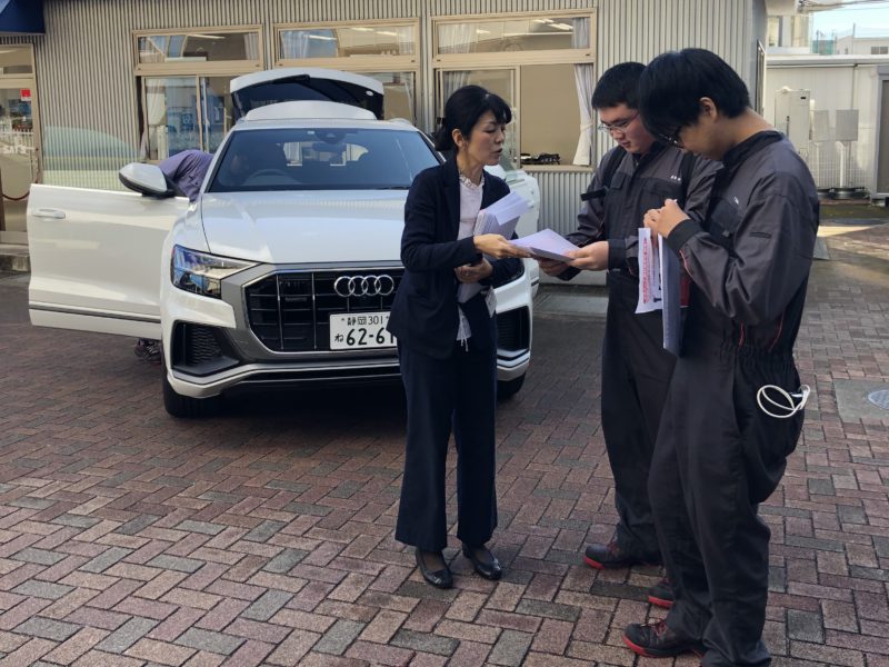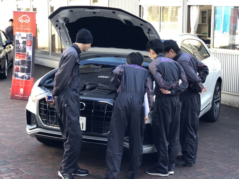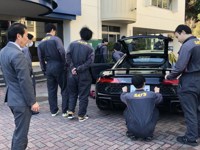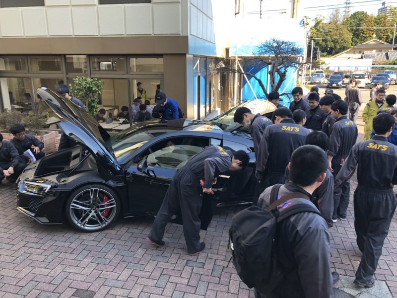 車両はアウディのR8、A7、Q8の3台。3台とも存在感抜群で、学生は写真のように嘗め回すように?食い入るように?眺め、皆魅了されていました。