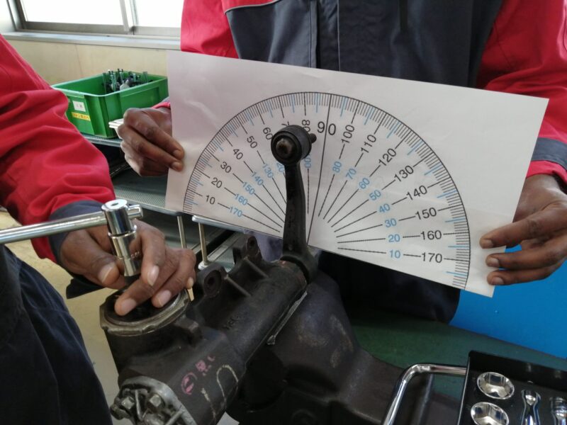 国際オートメカニック科1年生は、先日から「ステアリング実習」がスタートしました。ボール・ナット型と呼ばれるギヤ・ボックスを分解し組み立てたあと、最後に正常に作動するかを確認しました。写真は、ピットマン・アームと呼ばれる部品が稼働する角度を確認しているところです。