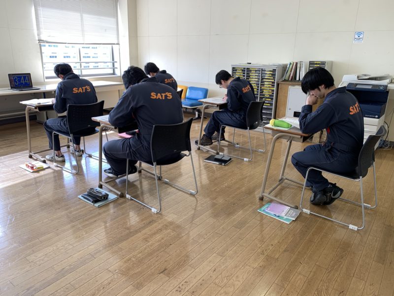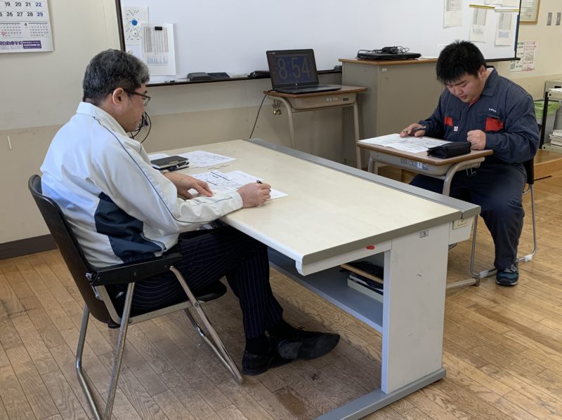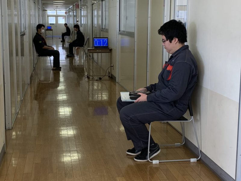 先日、自動車システム工学科の4年生がJAMCAの全国模試の筆記試験を受けましたが今日は口述試験です。JAMCAの会員校約50校の学生の中で3月に1級整備士の登録試験を受験する学生が、本日一斉に同じ試験を受験しています。試験は本番同様に思考時間10分+問診5分+整備説明5分で行われ、お客様役の教員と1対1での試験となります。毎年3年生が会場で見学し、3年生は来年の参考にし、4年生はより緊張感が高い中での受験で自分を高めます。数日たつと全体の中の自分の順位がわかるのです。(yagawa)