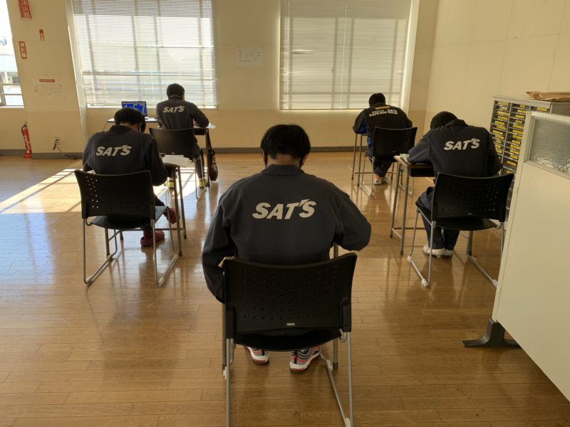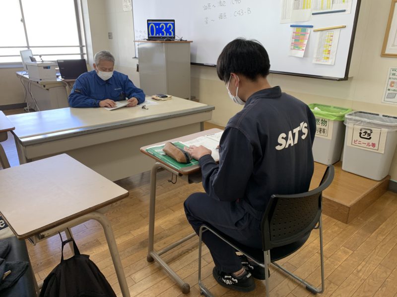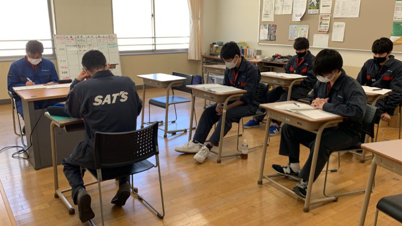 写真は時系列が逆になってますが、1枚目:試験の様子(周りに3年生)、2枚目:別の会場の様子(5会場で実施中)、3枚目:思考席で問題を読み攻略方法を思考中!、4枚目:ドキドキしながら待合室での順番待ち。