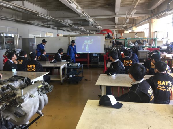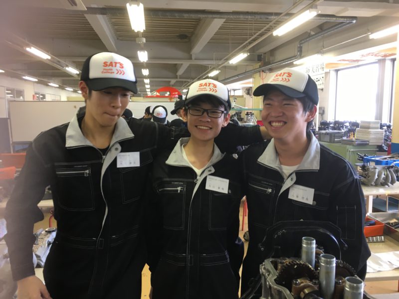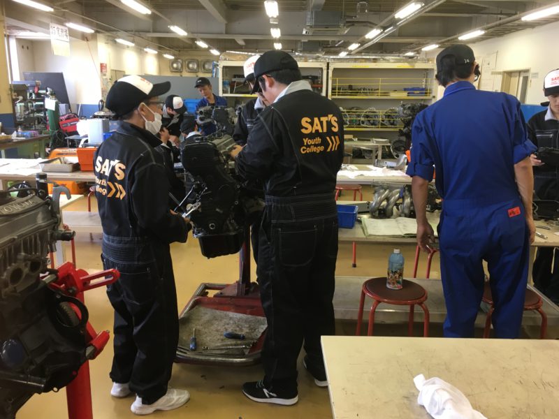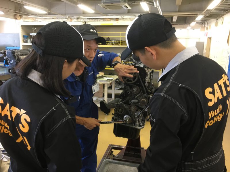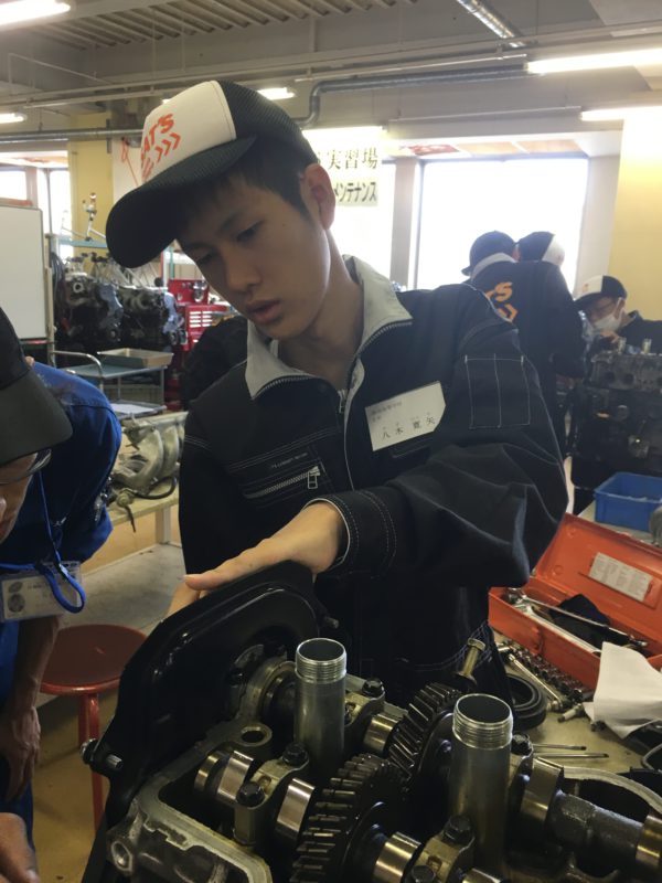 今回の体験は学内でのエンジン分解組立体験です。午前中はエンジンの構造をちょっぴり説明した後に分解。シリンダ・ヘッドまで外したかったんですがカム・シャフト取り外しまで。