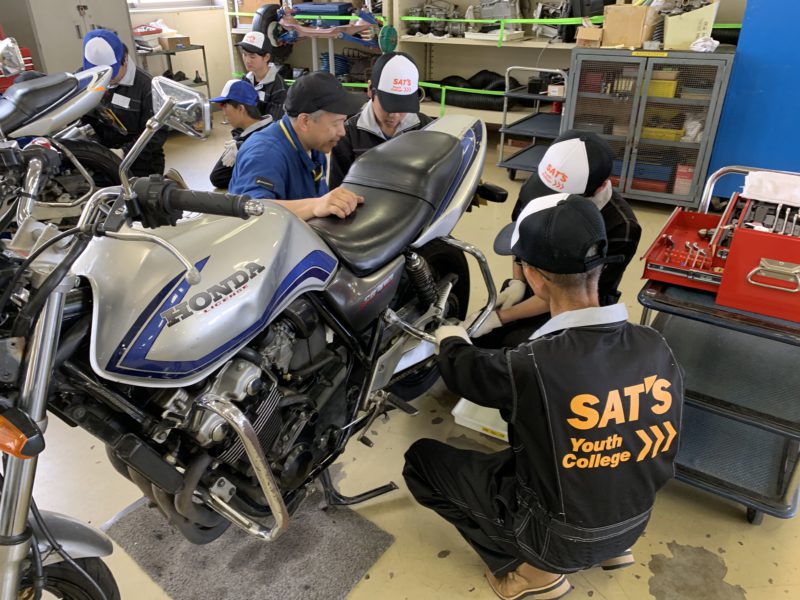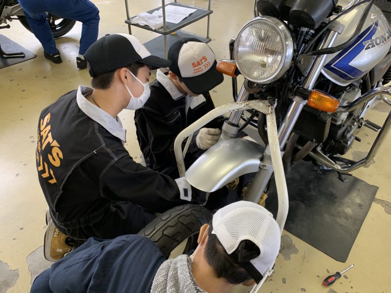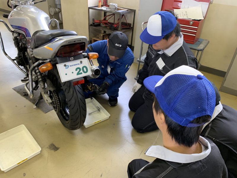 センタースタンド掛け、リアタイヤ脱着、チェーンの張り調整、フロントタイヤ脱着など、興味を持って作業に取り組んでくれました。