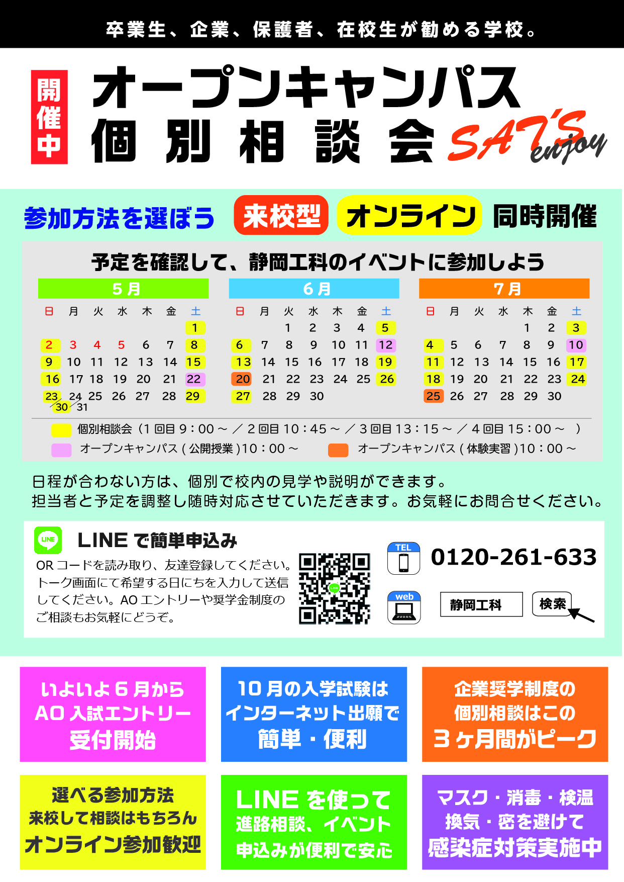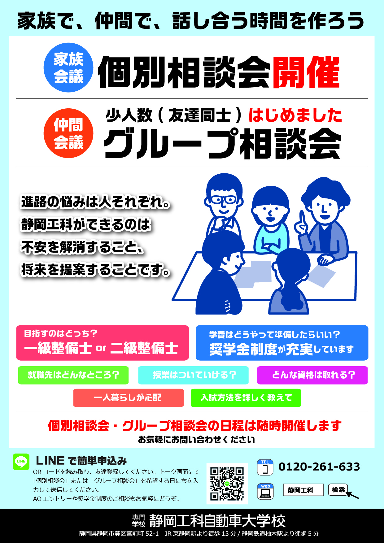昨年も個別相談会に多くのご家族がお越しくださいました。今年も個別相談会でじっくり進路の話、奨学金の話ができればと思います。そして今年新しい企画、友だち同士で集まって、みんなで静岡工科の話が聞けるグループ相談会をはじめました。