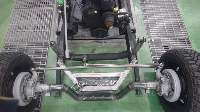 タイロッドをアームに当たってしまい、下がらない状態になってしまいました。その時に徹先生がタイロッドになりそうな鉄の丸い棒を持ってきてくださり、作ってくれました!タイロッドが当たらくなり、下がるようになりました。