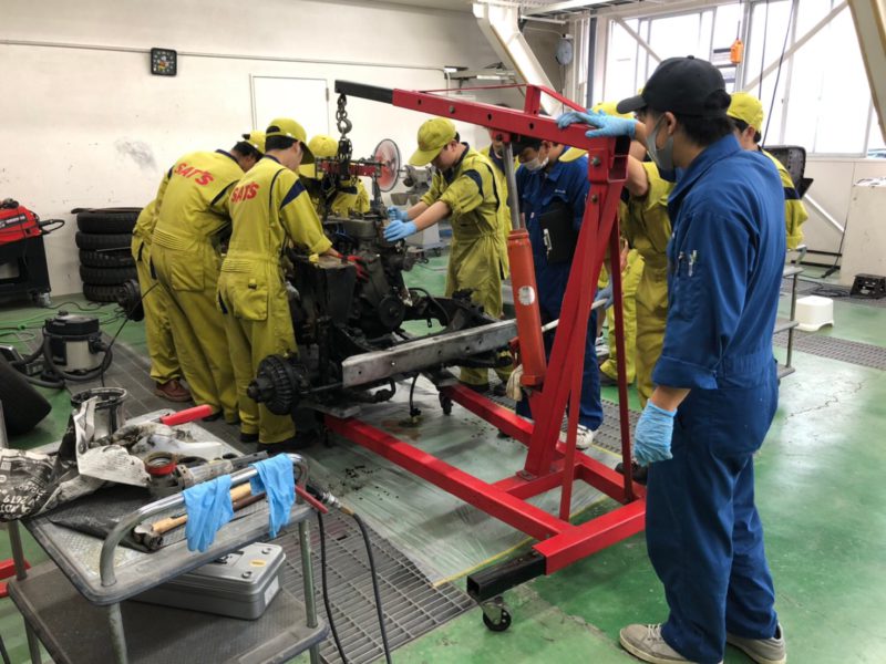 フレーム班では、エンジンを下ろそうとしているところです。クレーンを使い先生が誘導し、エンジンを持ち上げ怪我がないように慎重に作業しています。