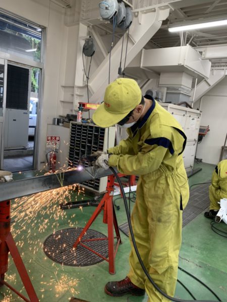 この作業は、フレームをシーノッチ加工するために長さを図り、角度を決め角度に沿って切ればコの字が作れるので鉄骨をプラズマカッターで切っているところです。