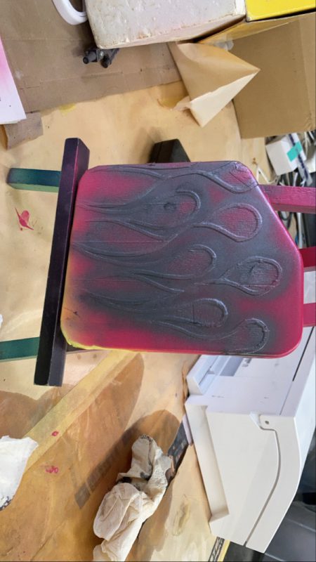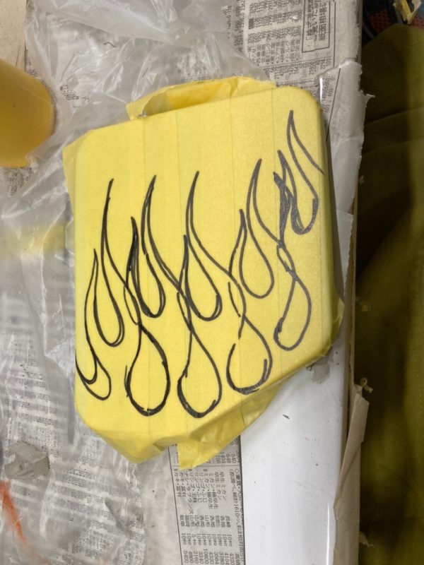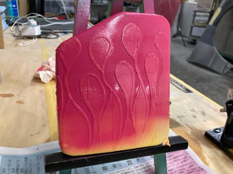 給油口にファイヤーパターンをエアブラシで入れます!!マスキングで色分けをしてボディーと同じピンクを塗ります。マスキングをはがしてクリアを塗ったら完成です!