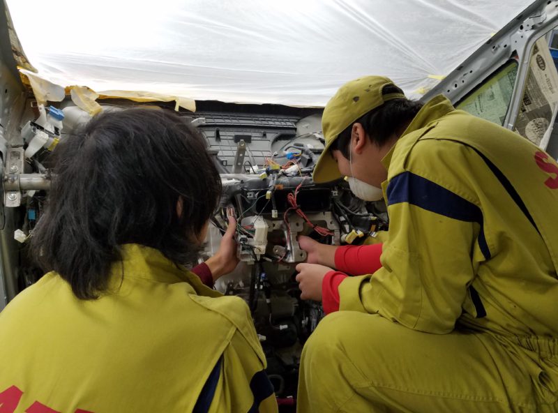 内装部は、フロントガラスがないためパテ粉などが入ってしまっているかもしれないので一度全部取り外しをすることになったのですが、