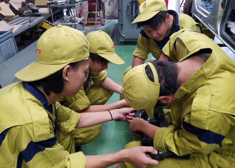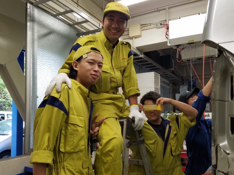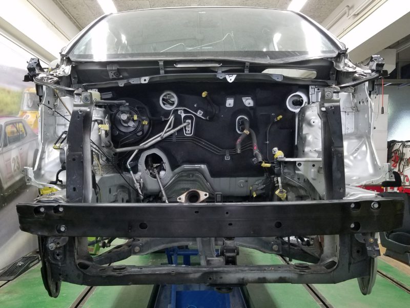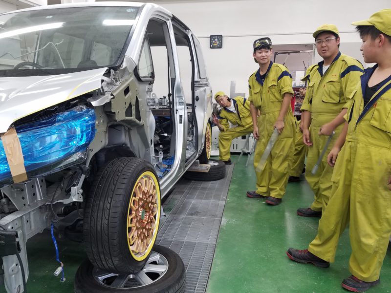 前回紹介したフレーム調整も終わりフロントの骨部はおおかま綺麗になり、ヘッドライトの軸を合わせるため学校に設備されている検査ラインで微調節しています。