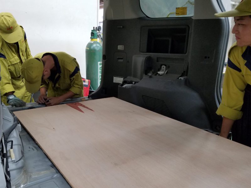 このカスタムカーは4ナンバーの2人乗りと決めていたので席があった所をうまく隠すように板でカバーしています。
