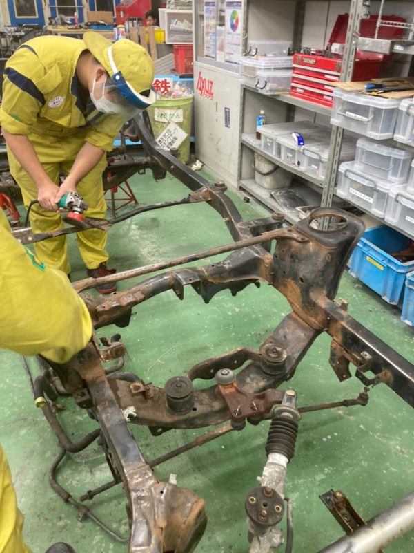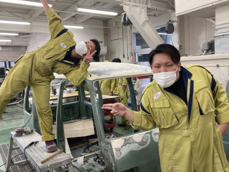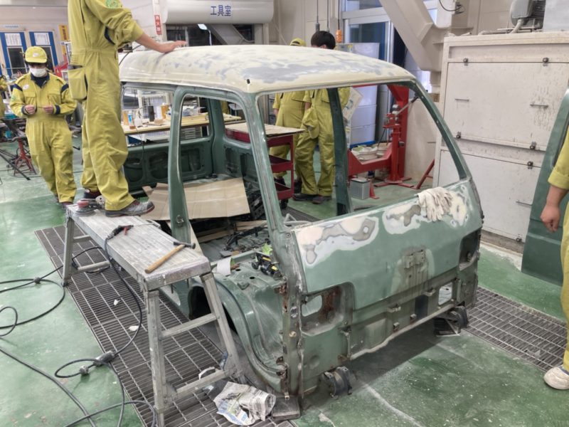こちらは、ボディの板金修理です!授業で習ったことをいかし、ハンマーやドリー・パテを使ってなおしていきます!!